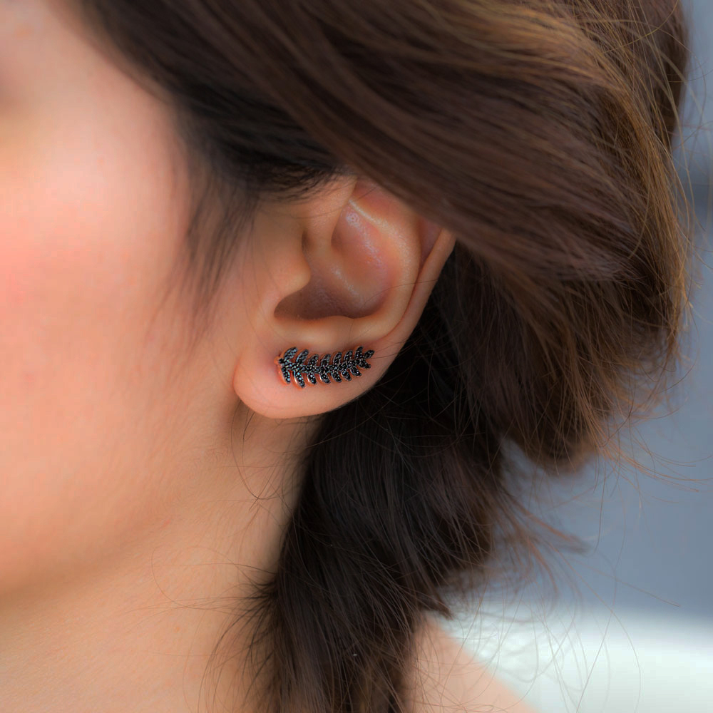 Add a touch of nature-inspired elegance to your collection with the Olive Leaf Design Climber Earrings. Made from high-quality 925 sterling silver, these earrings feature a beautifully detailed olive leaf design, symbolizing peace and prosperity. The earrings are adorned with sparkling black zircon stones that provide a striking contrast and enhance their sophistication. The climber earring style wraps around your ear, offering a chic and modern look that’s perfect for both casual and formal occasions.